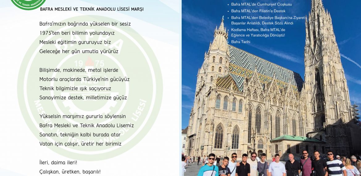 Cumhuriyet’in ilanı, ülkemiz için yepyeni bir çağın başlangıcı oldu. Eğitimden sanayiye, kültürden bilime her alanda büyük bir atılım gerçekleştirildi. Bizler de Bafra MTAL ailesi olarak, bu kutsal mirasın bilinciyle, siz gençlerimizi ülkemizin aydınlık geleceğine hazırlamanın sorumluluğunu taşıyoruz.