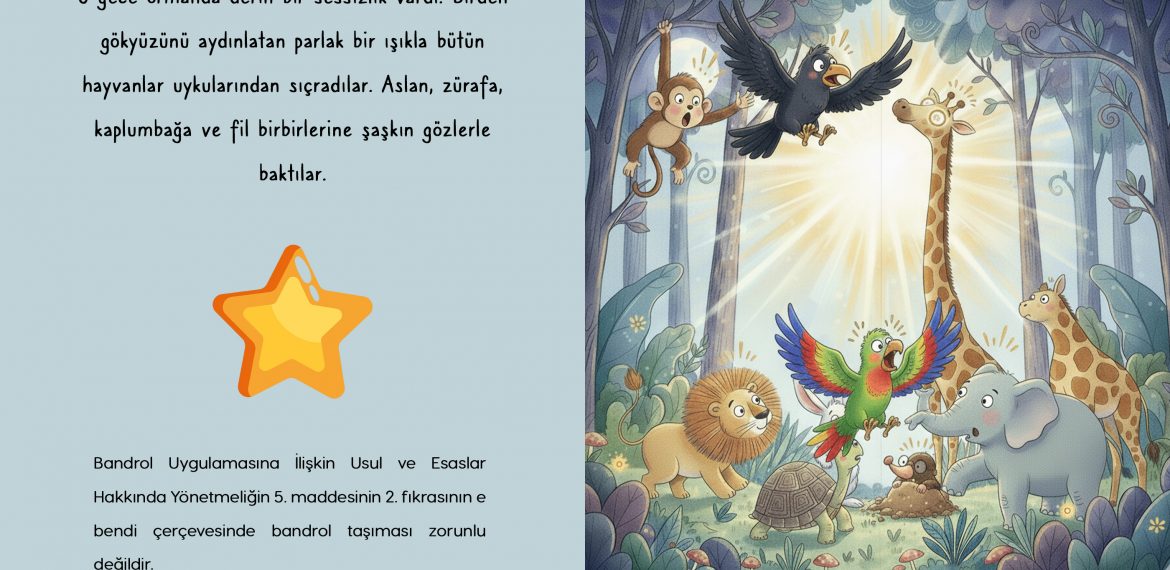 O gece ormanda derin bir sessizlik vardı. Birden gökyüzünü aydınlatan parlak bir ışıkla bütün hayvanlar uykularından sıçradılar. Aslan, zürafa, kaplumbağa ve fil birbirlerine şaşkın gözlerle baktılar.